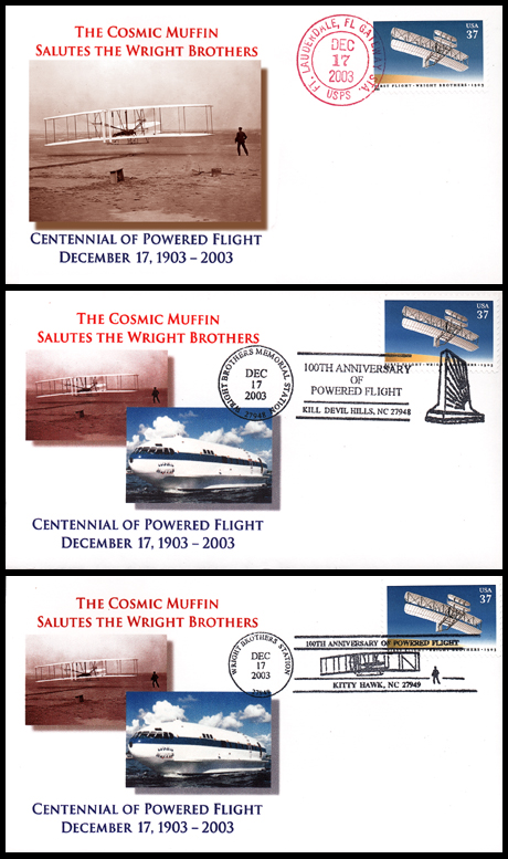Monster Nation TV Airing The Cosmic Muffin is to be featured on the Discovery Channels premiere episode of Monster Nation on November 1 at 7 p.m. EST. The planeboat was featured on the Travel Channels Amazing Vacation Homes on Sept. 13. Muffin Goes Google The powerful Google search engine has been added to the planeboats.com Web site, allowing visitors to seach for specific information within the site or to search the entire Web. The new search option has been added to the Site Index page. Flying Cloud Section Added A new section has been added to the planeboat Web site, which contains information about the restored Pam Am Stratoliner Flying Cloud, which was delivered to the National and Space Museum in August 2003. Philatelic Covers Salute the Wright Brothers A limited edition of three philatelic covers were issued by Plane Boats, Inc. on December 17, 2003 in honor of the 100th anniversary of the Wright brothers first powered flight. The covers were designed by Webmaster Albert W. Starkweather and were postmarked at Fort Lauderdale Gateway Station; Kill Devil Hills, NC, where the flight took place, and at Kitty Hawk, NC, where the Wrights were staying during the flight experiments. The latter pair have special pictorial cancellations issued by the U.S. Postal Service. The covers, are available at $5 each or $15 for the set of three plus a self addressed stamped envelope from: