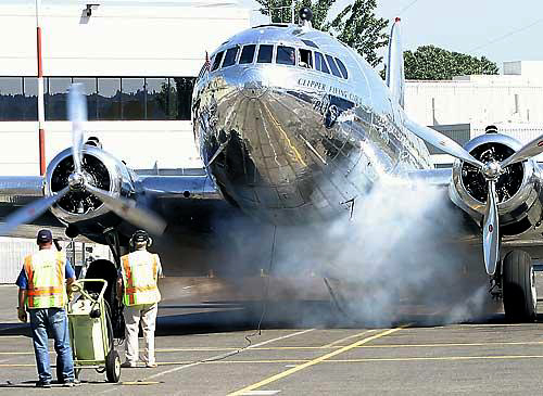 Exhaust billows yesterday from a restored Boeing 307 Stratoliner warming up for its Seattle departure. Volunteers restored the plane for a second time after a crash landing in Elliott Bay last year. Monday, July 28, 2003 Fly, fly again for vintage Stratoliner By Mark Bryant The last Boeing 307