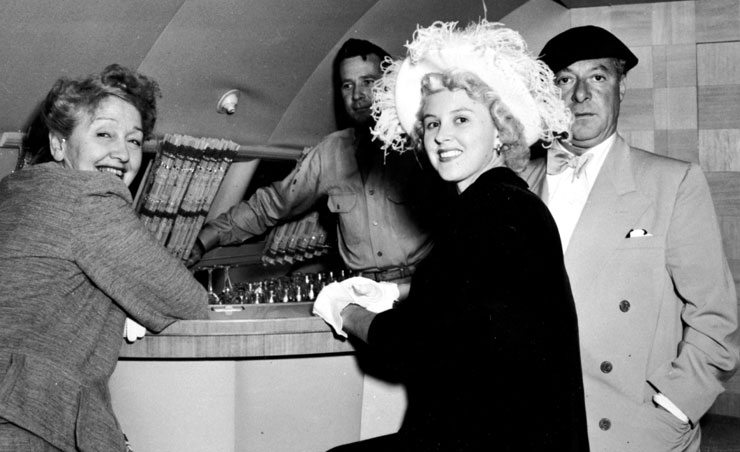 Gossip columnist Hedda Hopper, pilot Linton Carney, Houston socialite Helen Lutey, & comedian Georgie Jessel Photo taken for grand opening of Glenn McCarthys Shamrock Hotel in Houston, March 1949